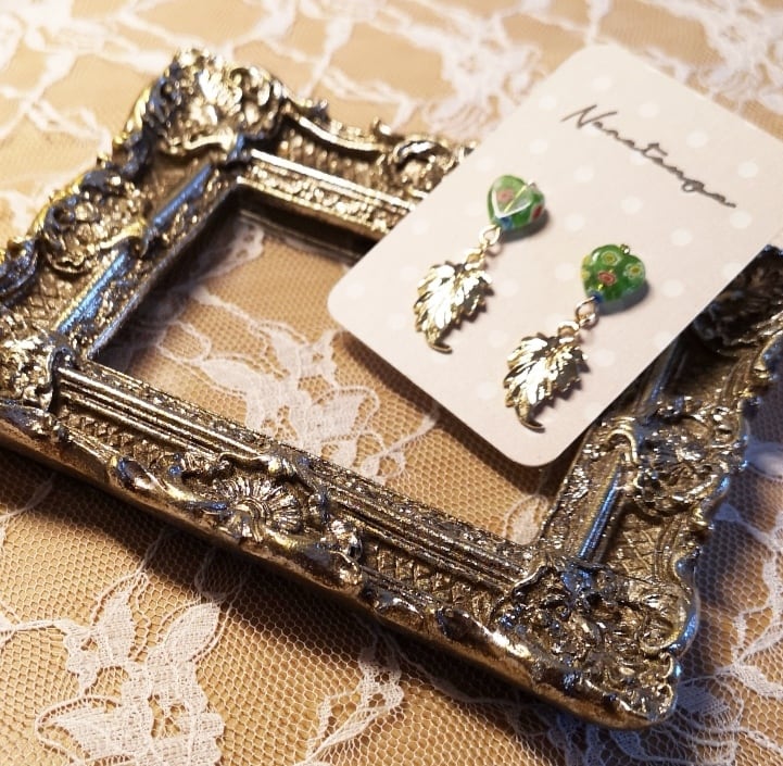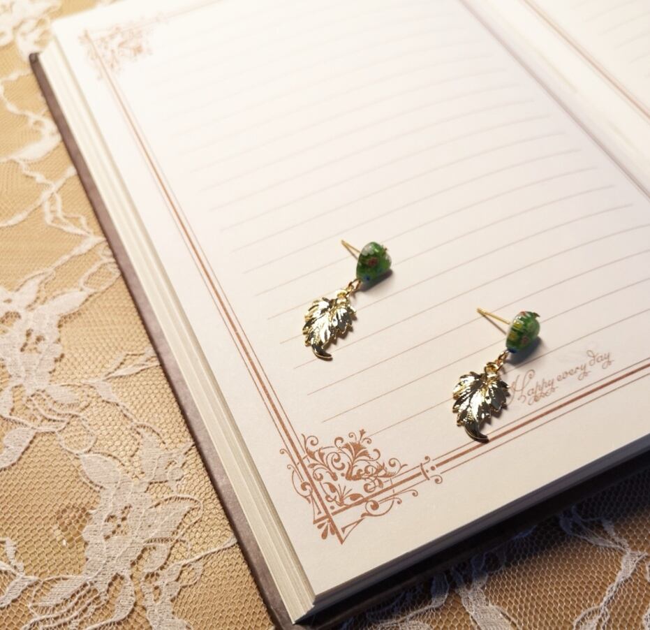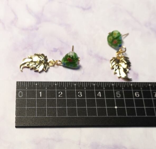 華やかで魅力的な、瑠璃ビーズのピアス 緑×葉っぱです。鮮やかな緑の瑠璃ビーズが耳元で煌めき、金色の葉っぱが揺れるデザインが女性らしい印象を与えます。季節を問わず様々なコーディネートに合わせやすく、カジュアルな日常使いから特別なイベントまで幅広く活躍するアイテムです。アレルギーの出にくいサージカルステンレス製ピアスを使用しているため、長時間快適にお楽しみいただけます。自分への特別なアイテムとしてはもちろん、大切な方への贈り物としても最適です!