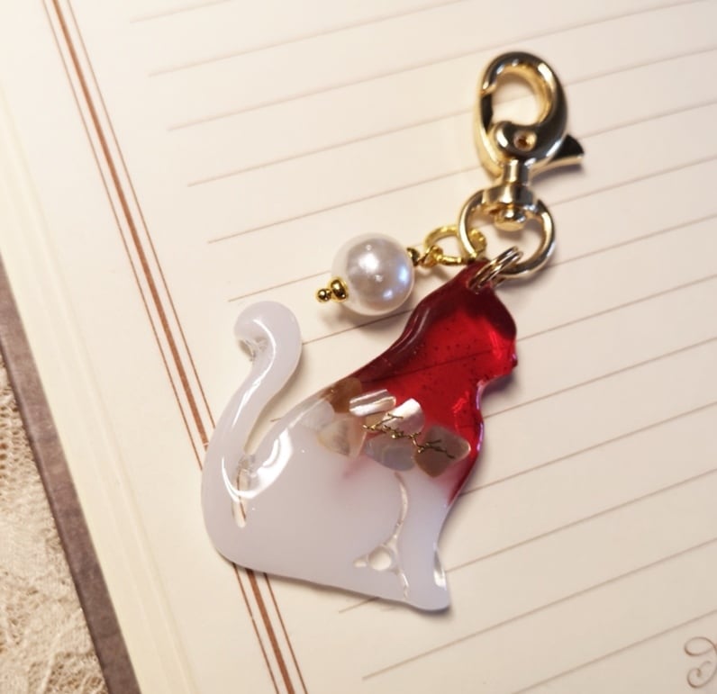 猫のキーホルダー クリアレッド×白