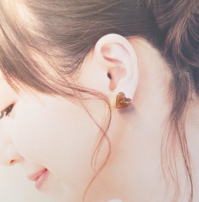 ・華やかなピンクラメのハートと金色の蝶々が、シンプルでありながらも個性的なアクセントを与えています。約15mmのサイズ感で、耳元をかわいらしく引き立てます。