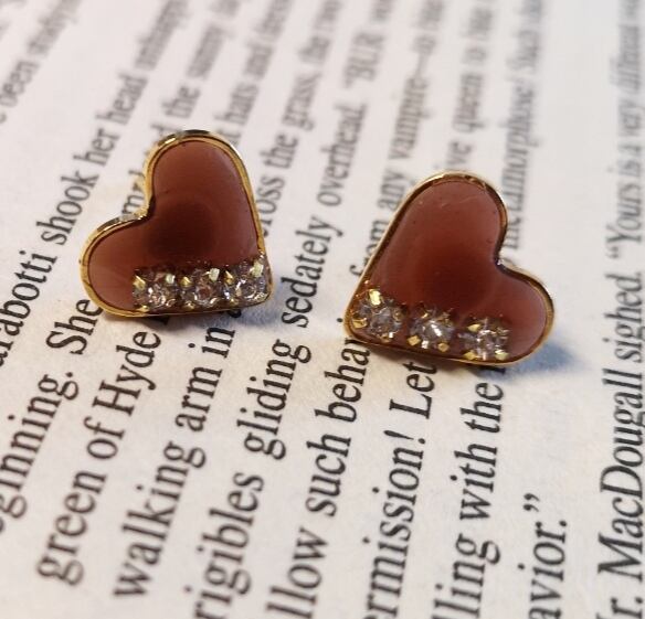 ・透け感のあるブラウンのハートと煌めくラインストーンが、シンプルでありながらも個性的なアクセントを与えています。約15mmのサイズ感で、耳元をかわいらしく引き立てます。