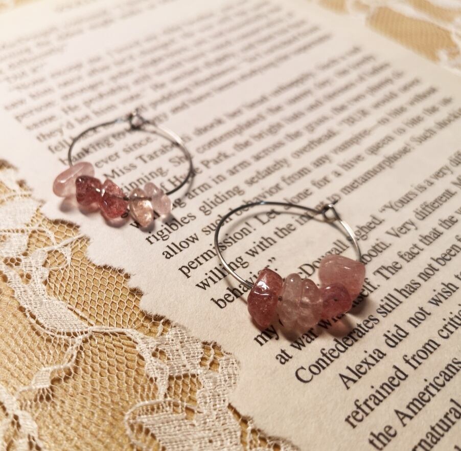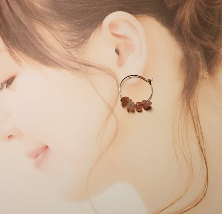 ・透明感のあるストロベリークォーツのさざれ石が、上品さと可愛らしさを兼ね備えています。フープデザインで耳元を華やかに演出し、洗練された印象を与えます。