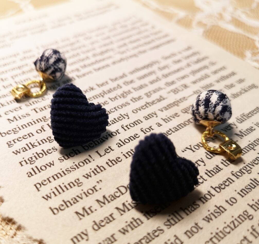 心踊る、紺のハートの2WAYピアスで、あなたの個性を引き立てませんか?コーデュロイ生地のハートとチェックのボンボンが、シンプルながらも可愛らしさを演出するアクセサリーです!カジュアルな装いにもぴったりで、さまざまなスタイルにマッチする特別なアイテムです。