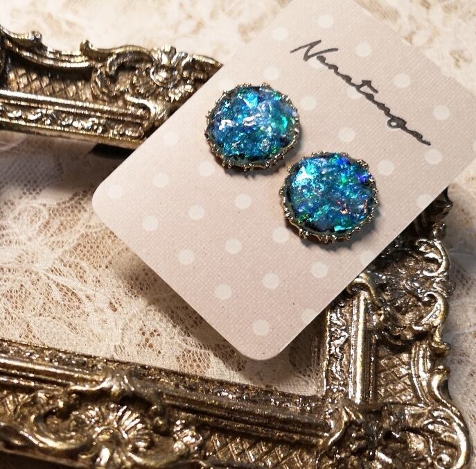 心を魅了する、オーロラのような煌めきを放つピアスです。青いオーロラの美しい輝きが、金色の縁取りによって強調され、エレガントさを感じさせる特別なアクセサリーとなっています!