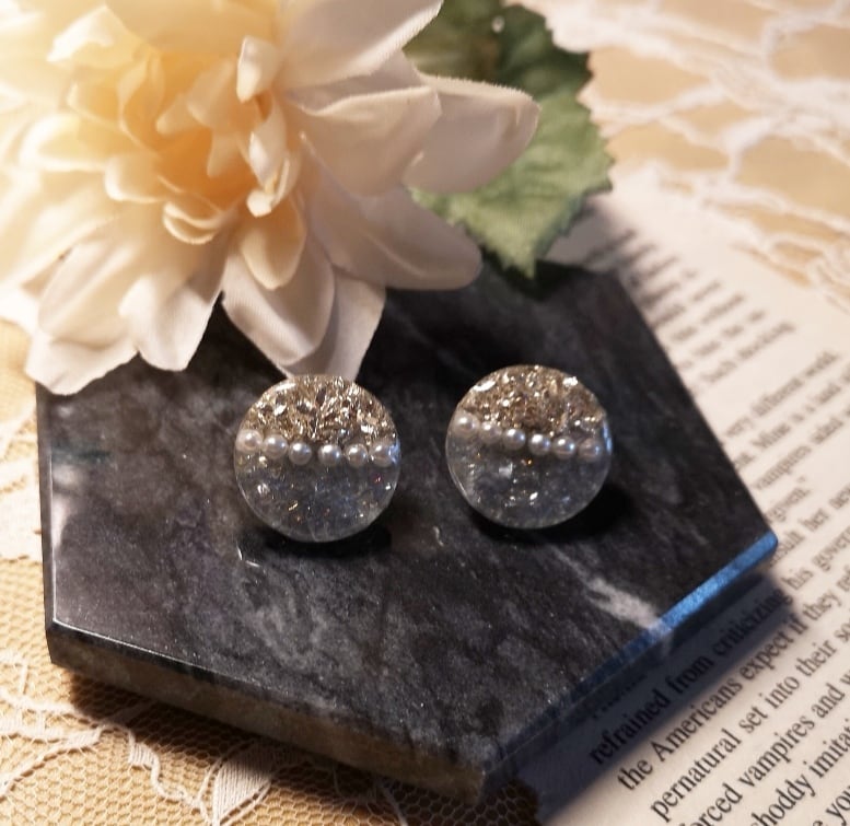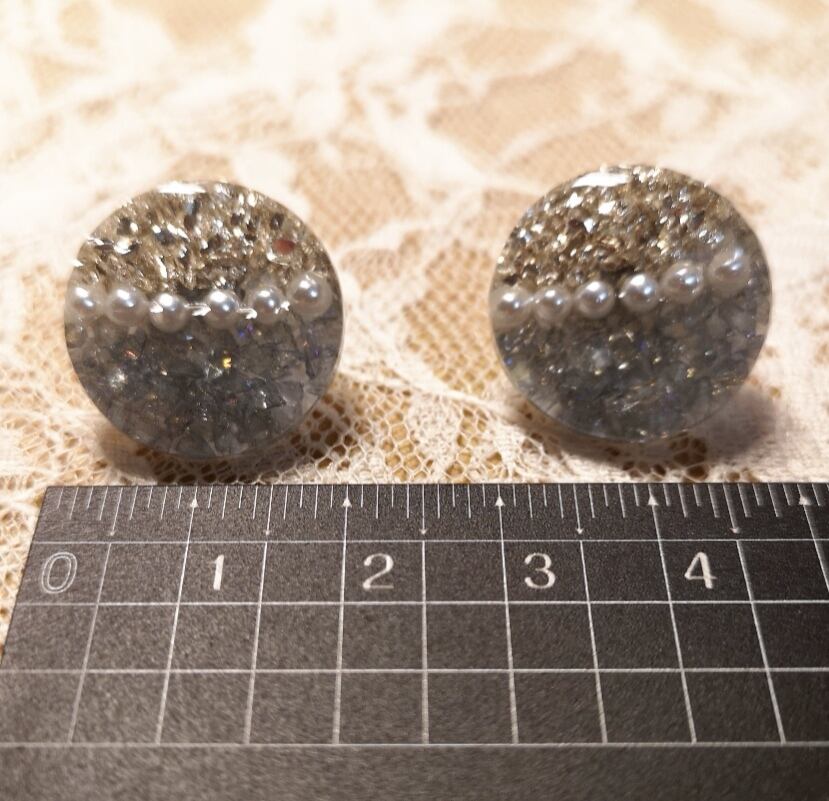 涼しげな印象を与える、涼風のピアスです。銀色と青グレーのバイカラーが調和し、並んだパールビーズが可愛らしさを引き立てる、特別なアクセサリーとなっています!