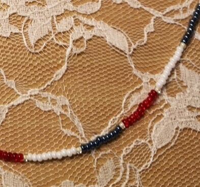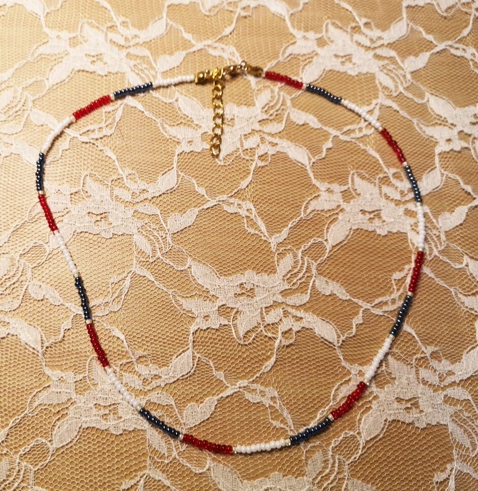 マリンカラーが引き立つチョーカーです。紺のメタリックビーズ、赤、白、パステルイエローのビーズが組み合わさり、夏のコーディネートに爽やかさをプラスします!カジュアルなお出かけから特別なシーンまで、幅広く活躍するアイテムとなっています!